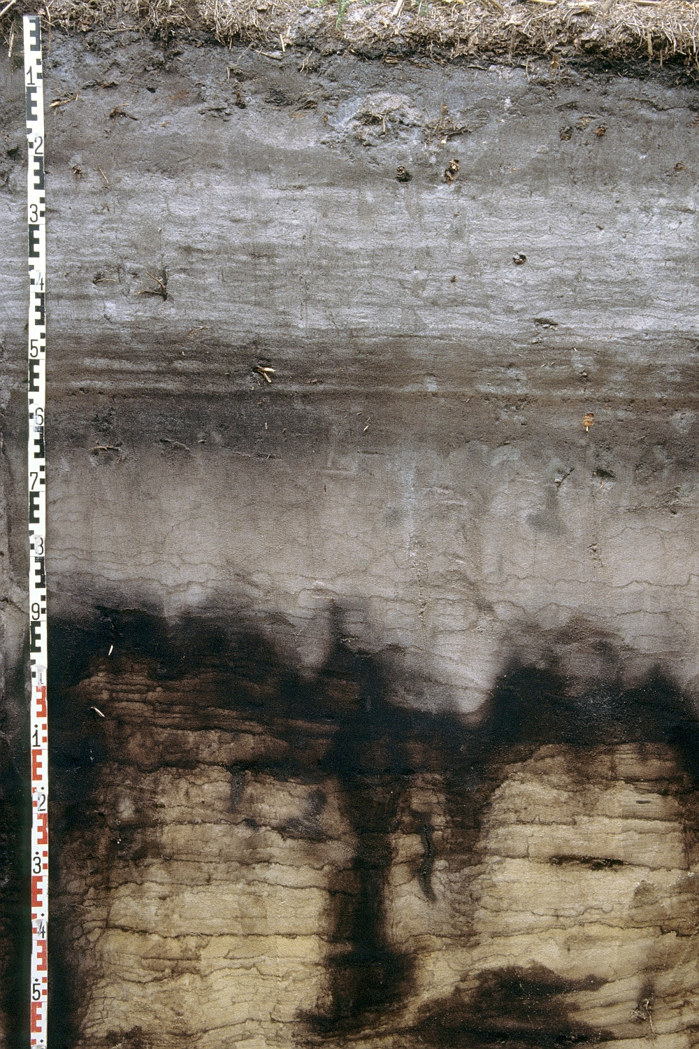 Äolium (Kolluvisol) aus deutlich geschichtetem angewehtem Bodenmaterial über fossilem Podsol aus Flugsand