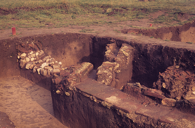 Reste der Hafenmauer des römischen Hafens in Xanten am Unteren Niederrhein, archiviert in einem braunen Auenböden, den der Rhein seit der Römerzeit abgelagert hat. © W. Paas/Geologischer Dienst NRW