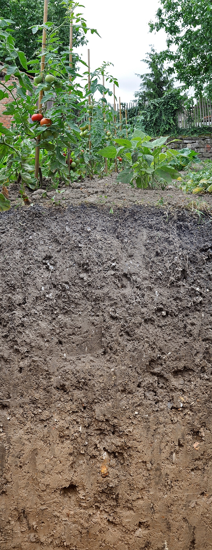 Gartenboden aus Erfurt. Tiefreichend humus, nährstoffreich und von zahlreichen Regenwurmgängen durchzogen. Durch jahrhundertelange Kompostwirtschaft stecken Keramikscherben, Ziegelreste und Haustierknochen im Boden. © Thüringer Landesanstalt für Umwelt und Geologie