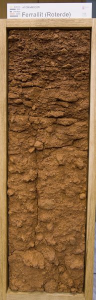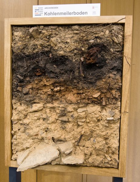 Zwei Archivböden als Botschafter der Kultur- und der Naturgeschichte: Links ein Kohlenmeilerboden aus dem Taunus als Beispiel der Kulturgeschichte und rechts eine Roterde aus der Vogelsberg-Region, entstanden im tropischen Klima der Tertiärzeit als Beispiel der Naturgeschichte. © Daniel Schwindt, Deutsche Bodenkundliche Gesellschaft